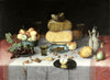 Op dit beroemde schilderij Stilleven met kazen van Floris Claesz van Dyck liggen vruchten, brood en drie kazen uitgestald op een kostbare bedekte tafel. De etenswaren en voorwerpen, waaronder het tinnen bord dat uitsteekt boven de tafelrand, lijken tastbaar echt.