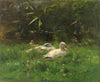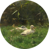Willem Maris, een van de bekendste schilders van de Haagse School, was beroemd om zijn landschappen met dieren, zoals koeien, schapen en vooral eenden. Eenden toont Maris’ kenmerkende stijl, waarin licht en sfeer de hoofdrol spelen. De eenden worden op een bijna impressionistische manier weergegeven, waarbij hun vormen opgaan in het zachte, diffuse licht dat het water en de omgeving verlicht. Dit schilderij straalt een kalme, pastorale sfeer uit, en de subtiele beweging van de eenden brengt het tafereel tot leven.