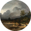 Een echt romantisch landschap, vol drama en contrasten. De ruiter houdt zijn hoed vast terwijl hij een goed heenkomen zoekt voor de plotselinge onweersbui. De laatste zonnestralen schijnen nog op de grond, maar storm en regen komen snel dichterbij. In dit vroege werk toont Roelofs zich nog romantisch. Later zou hij kiezen voor een realistische weergave van het landschap.
