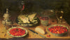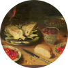 Dit stilleven op een richel of tafel bestaat uit druiven op een tazza, een duiventaart, een verguld zilveren kopje en deksel, moerbeien en wilde aardbeien in porseleinen schaaltjes, en een ijsgebakje versierd met zes snoepstaafjes rond een bloem op een steeltje. Het gebakje is waarschijnlijk een bruidstaart of bruidstaart, de bloem is mogelijk bonte roze.16 Duiventaarten werden het vaakst afgebeeld in Haarlemse stillevens, zoals die van Pieter Claesz uit de late jaren 1620.17 De schaaltjes hebben de vorm van porselein van Kraak, maar de decoratie is niet meer volledig zichtbaar door slijtage.